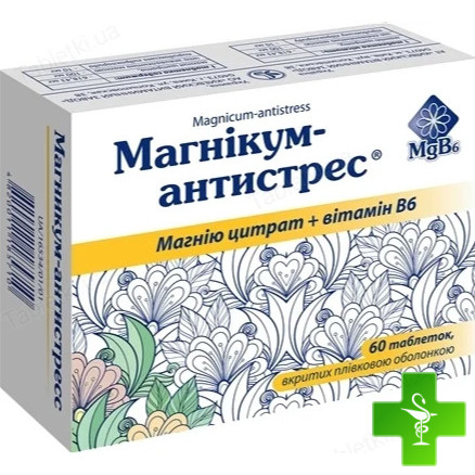 1 таблетка містить магнію цитрату 618,43 мг, що еквівалентно магнію 100 мг, і піридоксину гідрохлориду 10 мг;