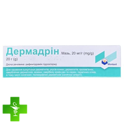 Дермадрін містить блокатор Н1‒рецепторів дифенгідраміну, який селективно пригнічує Н1‒рецептори гістаміну. Дифенгідраміну гідрохлорид - ефективний антигістамінний та протиалергічний засіб з вираженою протисвербіжною активністю. Додатково чинить місцеву анестезуючу та знеболювальну дію. Кремоподібна основа мазі не подразнює шкіру та робить процес нанесення легким та рівномірним. Основою мазі є водно‒олійна емульсія, яка надає препарату охолоджувальний ефект. При місцевому застосуванні діюча речовина мазі проникає у шкіру і підшкірні шари. Протисвербіжний та знеболювальний ефект настає одразу після нанесення мазі і триває від 2 до 6 годин.