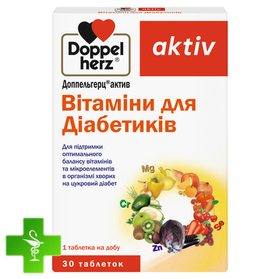 Вітамінний комплекс Доппельгерц®актив Вітаміни для діабетиків здійснює цілеспрямоване забезпечення організму спеціально підібраними для цієї мети вітамінами, мікроелементами та мінеральними речовинами. Розроблений у відповідності з урахуванням добової потреби хворого на цукровий діабет. Вітаміни, що входять до складу комплексу, сприяють покращенню обміну речовин, стимулюють імунологічну резистентність до дії різних мікробних агентів, підсилюють стійкість до несприятливих факторів навколишнього середовища. Нестача в харчуванні мінеральних речовин та вітамінів може стати одним з тригерних факторів розвитку важких ускладнень цукрового діабету. Внаслідок, підвищується ризик виникнення ураження судин сітківки ока, ураження стінок судин нирок, а також підвищується ризик виникнення невропатій.
