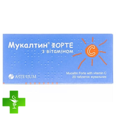 Мукалтин® Форте з вітаміном С - відхаркувальний засіб, дія якого зумовлена секретолітичними і бронхолітичними властивостями. Препарат чинить помірну протикашльову дію, зменшує кількість нападів кашлю та їх інтенсивність, збільшується кількість мокротиння та зменшує його в'язкість. Має пом'якшувальну, протизапальну та обволікаючу дію. Нормалізує змінену бронхолегеневу секрецію, покращує виділення мокротиння.